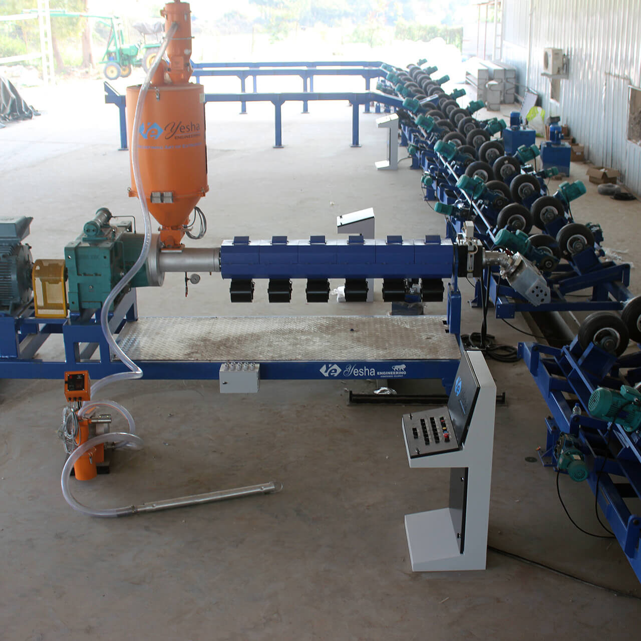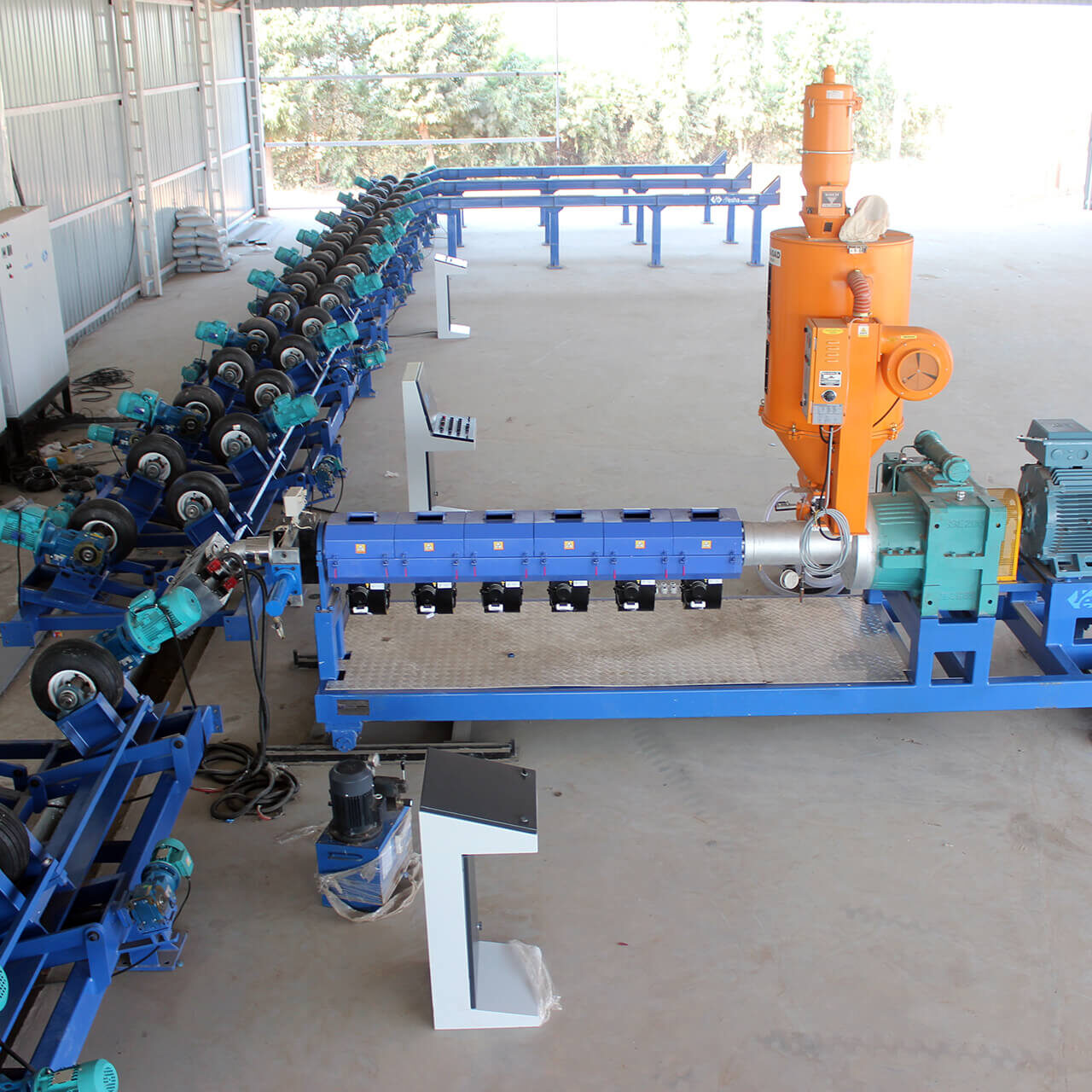 Efficient single screw extruder with water-cooling force feeding system, and barrel with grooving in the feeding zone are designed to save power of main motor; Long L/D ratio and mixing head are designed to get perfect jellification and high output.